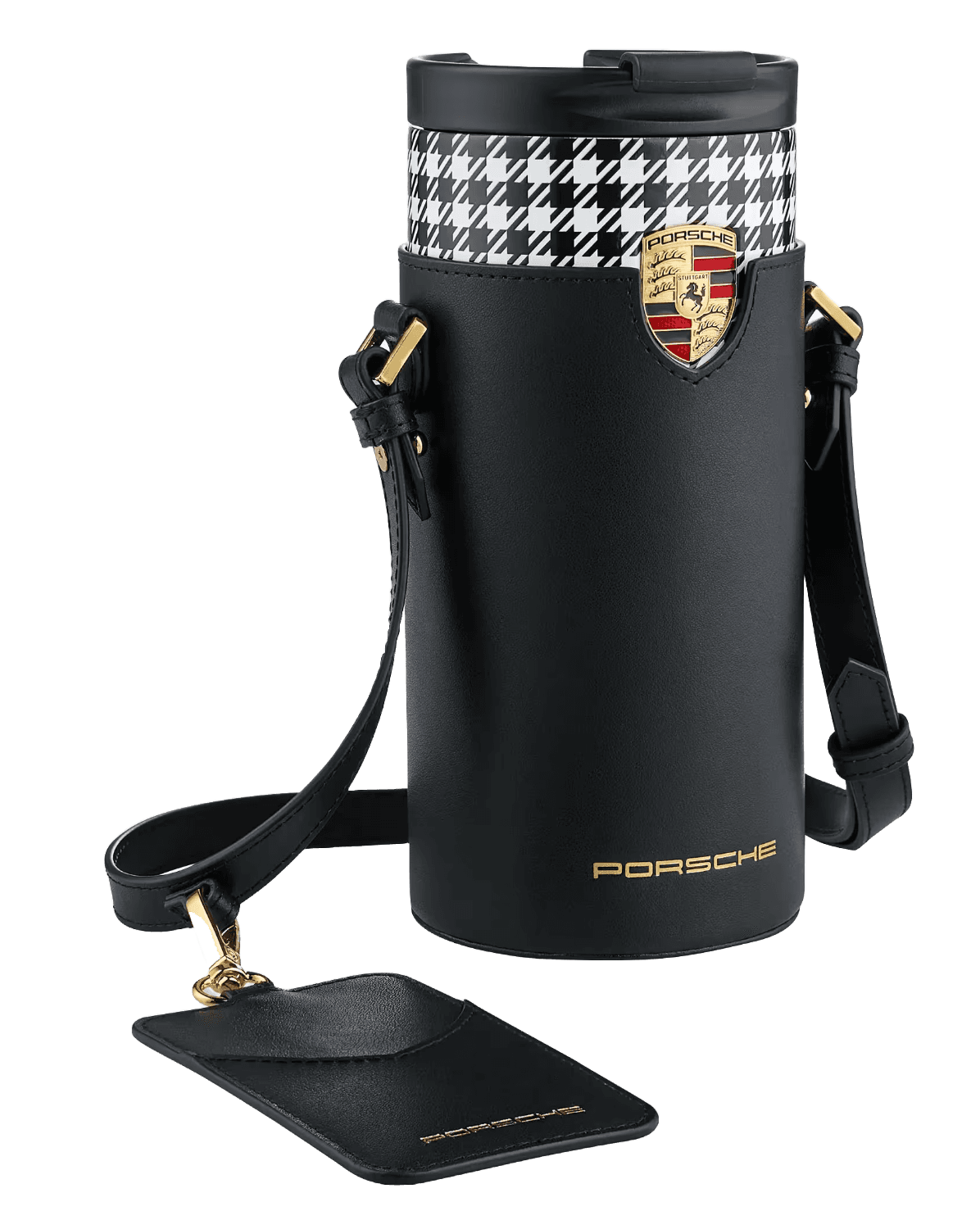 Elegant shoulder bag for Porsche thermal travel cup with additional card holder.